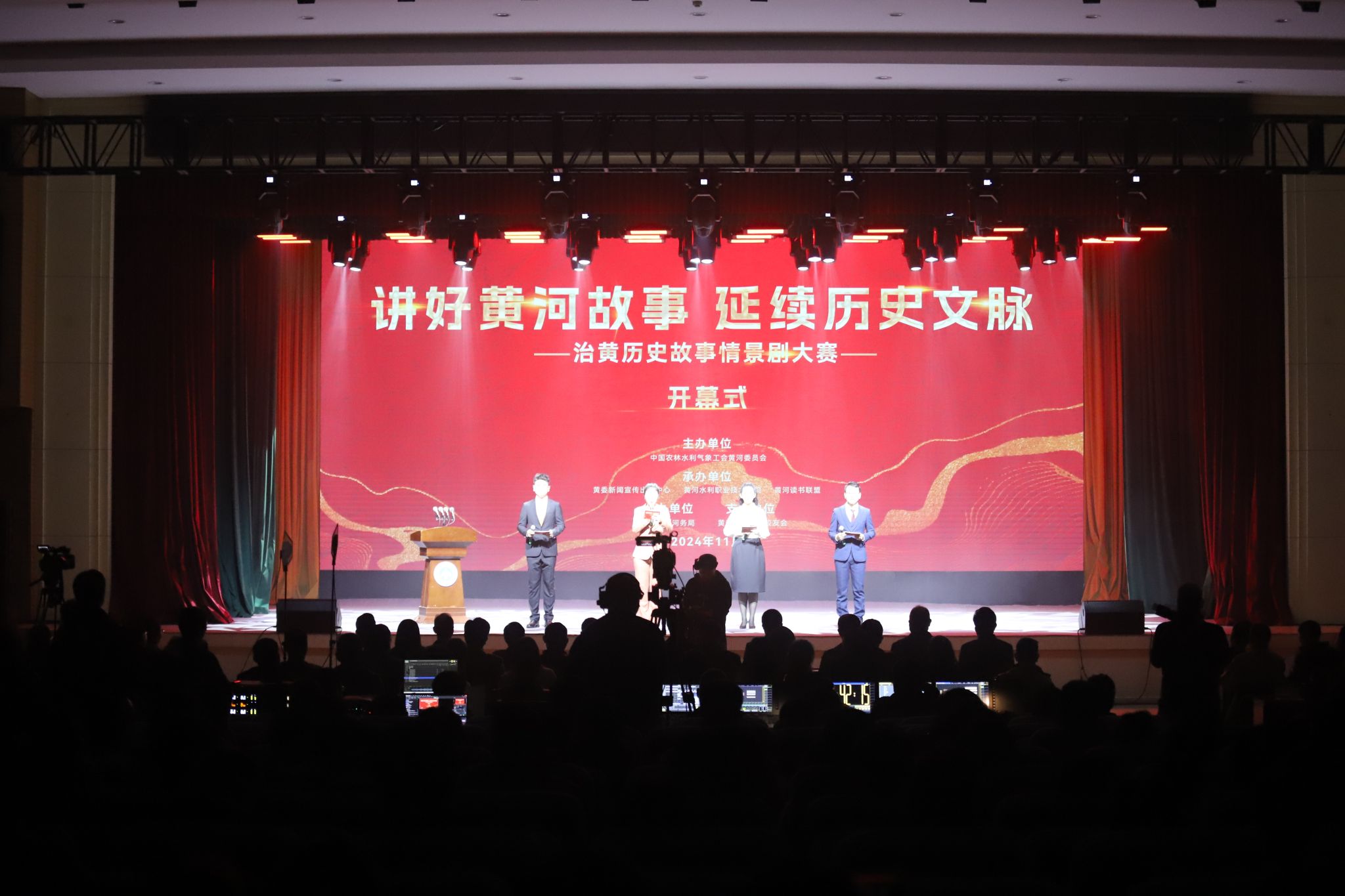 大地流金,万物呼晴。11月6日,由中国农林水气象工会黄河委员会发起主办、黄委新闻宣传出版中心、黄河水利职业技术学院等单位承办的“讲好黄河故事 延续历史文脉——治黄历史故事情景剧大赛”决赛在我校拉开帷幕。黄河水利委员会机关党委专职副书记张建中;河南省总工会党组成员、副主席黄健;黄河水利职业技术学院党委副书记、校长胡昊;中国农林水气象工会黄河委员会常务副主席柴建国;黄委新闻宣传出版中心党委书记、主任张松;河南河务局党组成员,纪检组长朱清韶;黄河水利职业技术学院党委副书记、工会主席杨士恒,副校长菅浩然,校友总会副会长、郑州校友联络处理事长郭启文出席决赛开幕式。