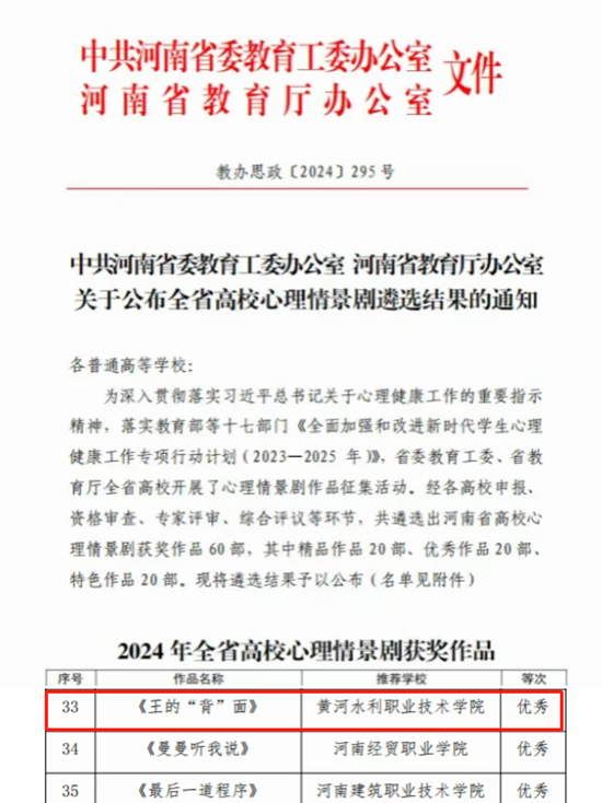 近日,河南省教育厅发布《完美网页版公布全省高校心理情景剧遴选结果的通知》,经资格审查、专家评审、综合评议等环节,我校报送的《王的“背”面》获评河南省高校心理情景剧优秀作品。