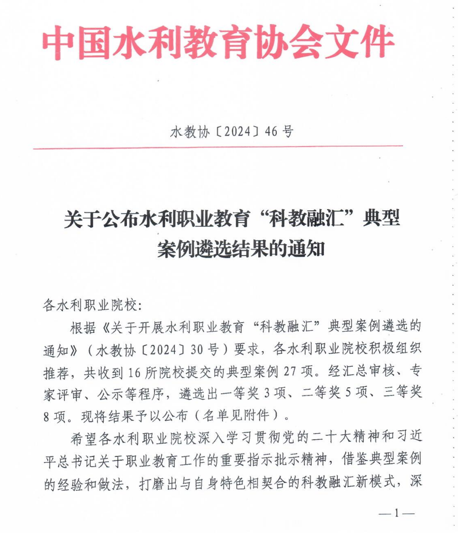 近日,中国水利教育协会公布首批水利职业教育“科教融汇”典型案例遴选结果,我校《基于“研转服创”多元育人的水利职业教育科教融汇实践》和《科教产创四位一体,打造水利类专业课高质量发展新生态--以《水力分析与计算》课为例》典型案例双双荣获一等奖。