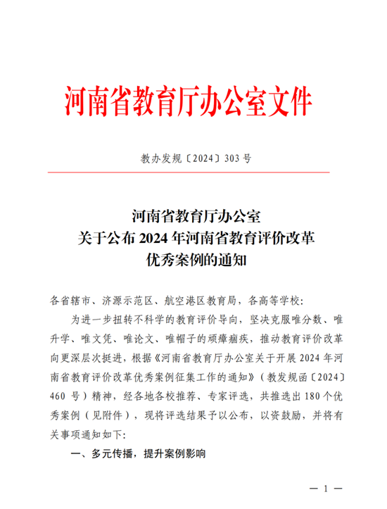 近日,河南省教育厅办公室发布《河南省教育厅办公室完美网页版公布2024年河南省教育评价改革优秀案例的通知》(教办发规〔2024〕303 号),全省教育系统共评选出180个优秀案例,我校推荐的《高校教学与科研良性互动评价体系的构建》等4个案例全部入选,获得一等奖1项,二等奖2项,三等奖1项。
