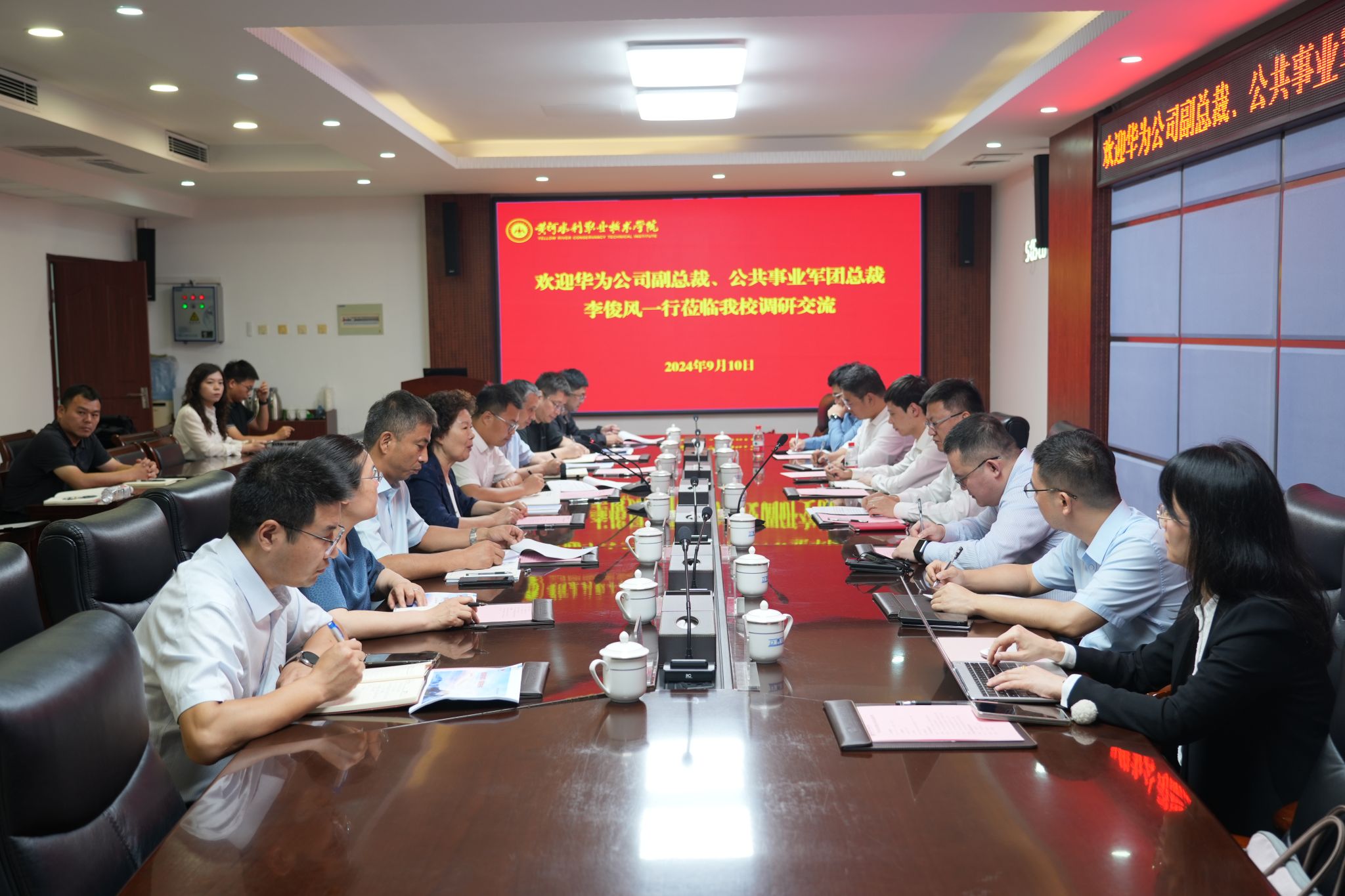 9月10日,华为技术有限公司(以下简称“华为”)副总裁、公共事业军团总裁李俊风一行来我校调研交流。我校党委书记周保平,党委副书记、校长胡昊,副校长菅浩然、朱焕立等出席交流活动。党政办公室、教务处、招生就业服务中心、信息化管理办公室、信息工程学院、国家智能社会治理实验基地等部门、学院负责人参加交流。