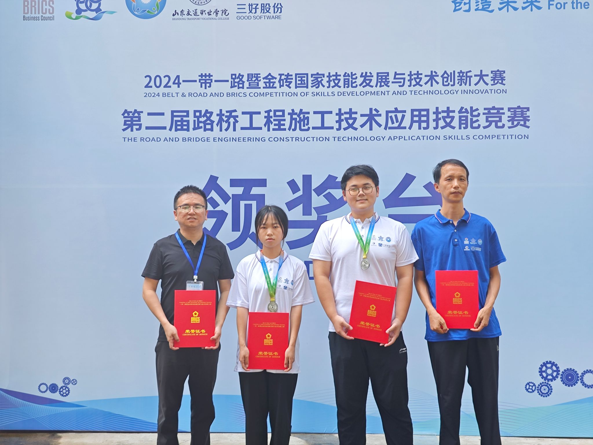 近日,2024一带一路暨金砖国家技能发展与技术创新大赛第二届路桥工程施工技术应用赛项(BRICS-ST-028)全国总决赛在山东潍坊举行。经过激烈角逐,由我校教师朱益兵、施小明指导,学生刘兴旺、李文蝶组成的代表队荣获二等奖;黄河水利职业技术学院获得“优秀组织奖”。