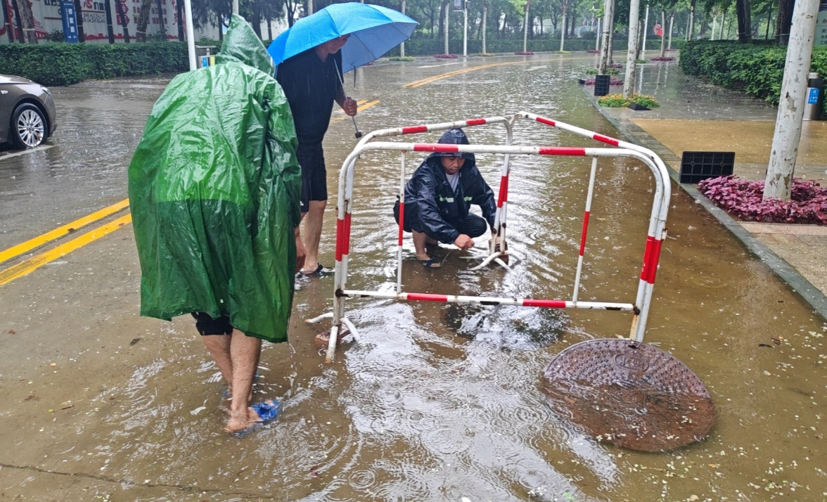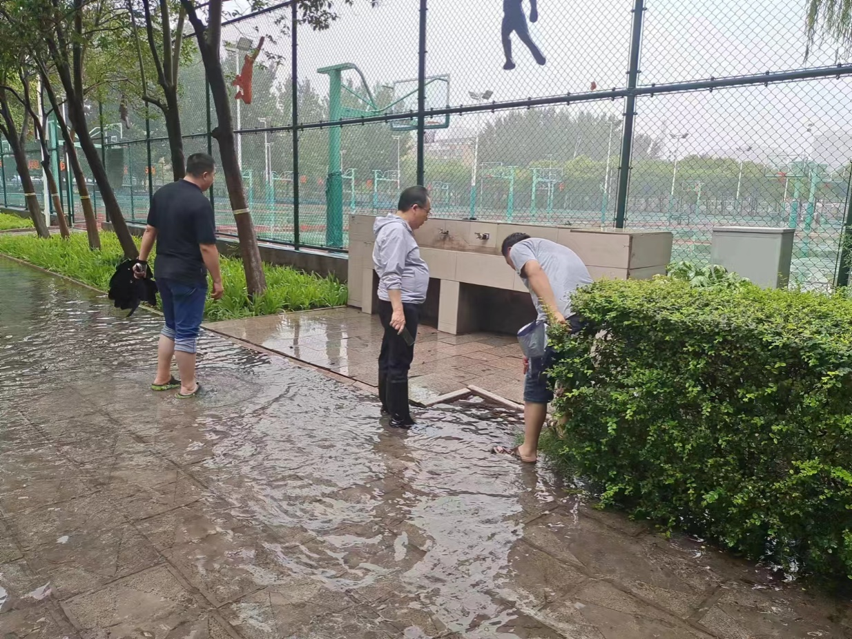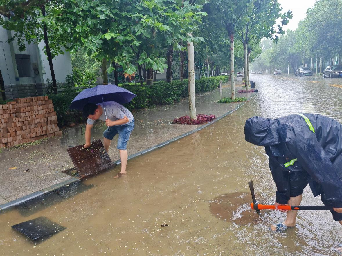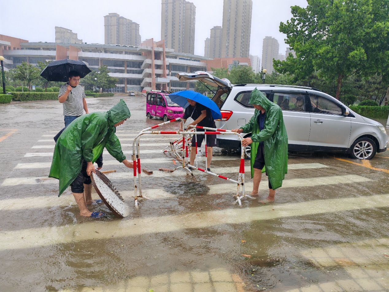 7月17日,在开封市启动防汛二级应急响应,天降暴雨的情况下,后勤管理服务中心、保卫部等相关部门工作人员实地检查校园环道积水、景观湖、宿舍区道路等实地开展全覆盖、地毯式排查,组织人力开展排水排污作业,冒雨完成了疏通排涝、清扫积淤、打开排水井盖板、疏通里仁居堵塞的下水管道等工作并及时处理各类突发情况。