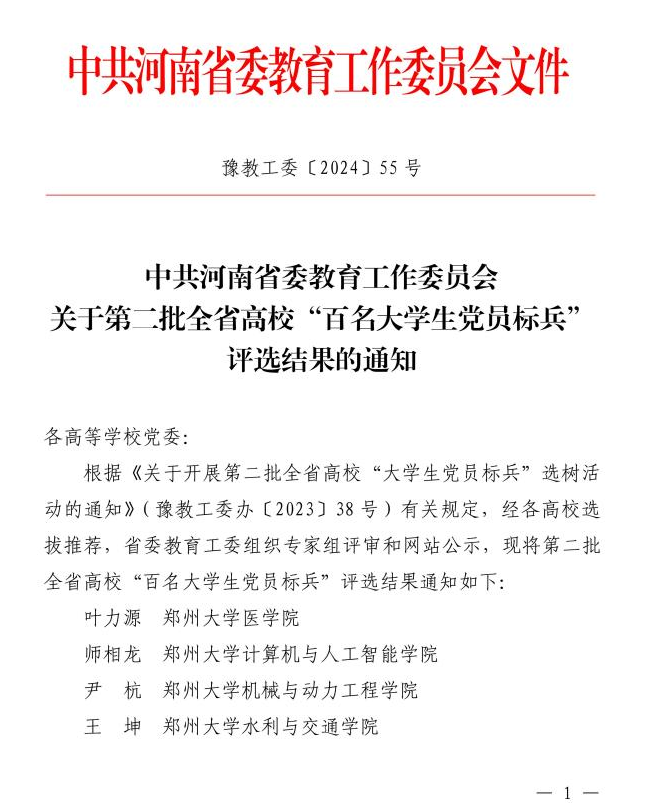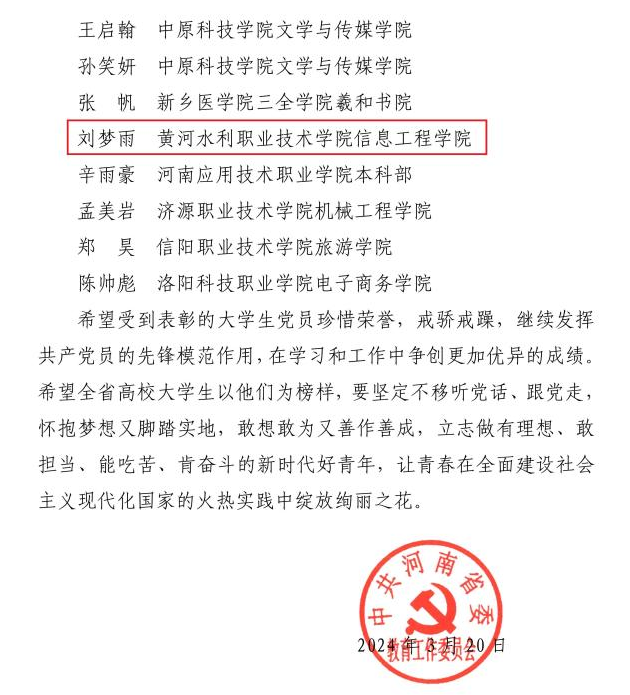 近日,中共河南省委教育工委公布了《完美网页版第二批全省高校“百名大学生党员标兵”评选结果的通知》(豫教工委〔2024〕55号),我校信息工程学院学生党员刘梦雨荣获全省高校“大学生党员标兵”荣誉称号。