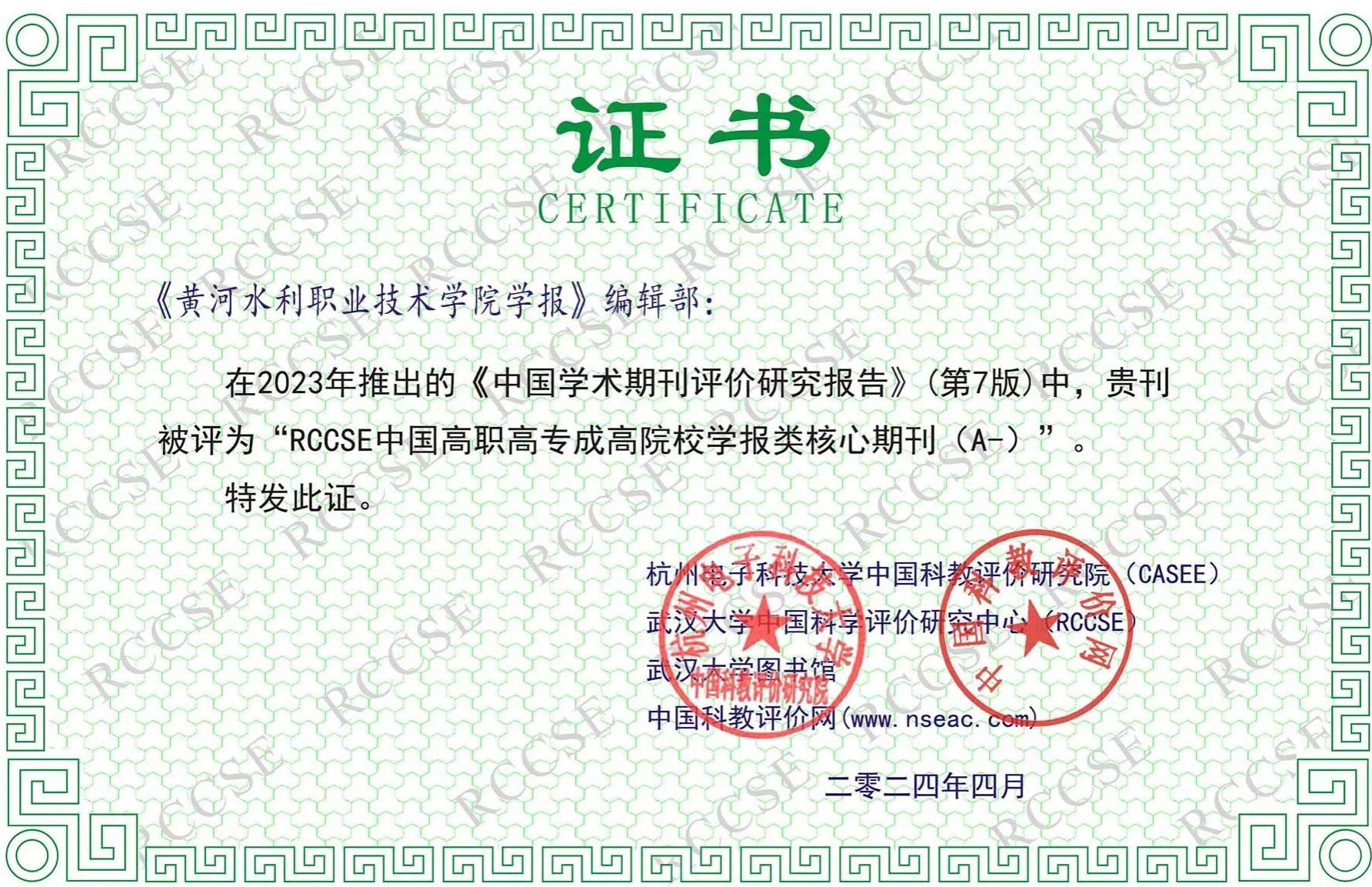 近日,RCCSE《中国学术期刊评价研究报告》(第7版)发布,经研究人员对相关文献的检索、统计和分析,以及学科专家的评审,《黄河水利职业技术学院学报》被评定为“RCCSE中国高职高专成高院校学报类核心期刊(A-)”。同时,学报还入选“RCCSE水利工程类准核心学术期刊(B+)”,在认定收录的71种水利工程学科类期刊中排名第31位。