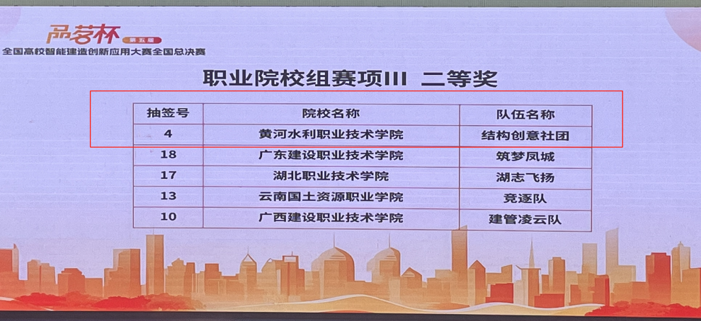 4月21日,第五届“品茗杯”全国高校智能建造创新应用大赛(以下简称大赛)全国总决赛在徐州落幕。在胡畔、靳静老师的指导下,我院建筑工程技术专业学生苏帅旗、冯朝阳、郭俊涛、刘春光、郭赵和组成的“结构创意社团”团队经过层层筛选和激烈竞争荣获河南赛区预赛一等奖,全国总决赛二等奖。