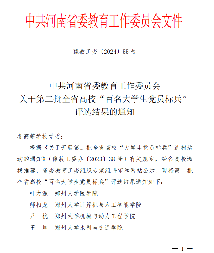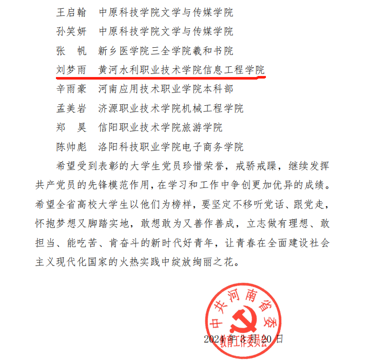 近日,中共河南省委教育工委公布了《完美网页版第二批全省高校“百名大学生党员标兵”评选结果的通知》(豫教工委〔2024〕55号),信息工程学院学生党员刘梦雨荣获全省高校“大学生党员标兵”荣誉称号。