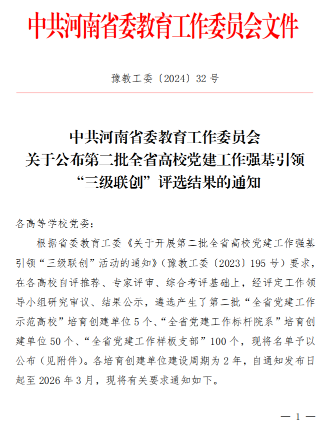 近日,中共河南省委教育工委发布了《完美网页版公布第二批全省高校党建工作强基引领“三级联创”评选结果的通知》(豫教工委〔2024〕32号)。我校的党建“双创”工作取得新突破,入选全省党建工作“标杆院系”培育创建单位和全省党建工作“样板支部”培育创建单位各1个。