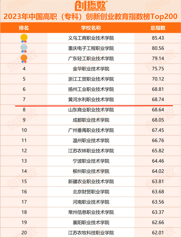 12月28日,第三方高校创新创业教育评价研究咨询服务机构“创指数”正式推出“2023年中国高职(专科)院校创新创业教育指数榜”。该榜单评价范围涵盖了1545所高职(专科)院校。我校入选2023年中国高职院校创新创业教育指数榜河南省高职(专科)院校第一名,全国第7名,较2022年的全国排名第14名上升7位,充分彰显了我校“双高计划”建设的成效。