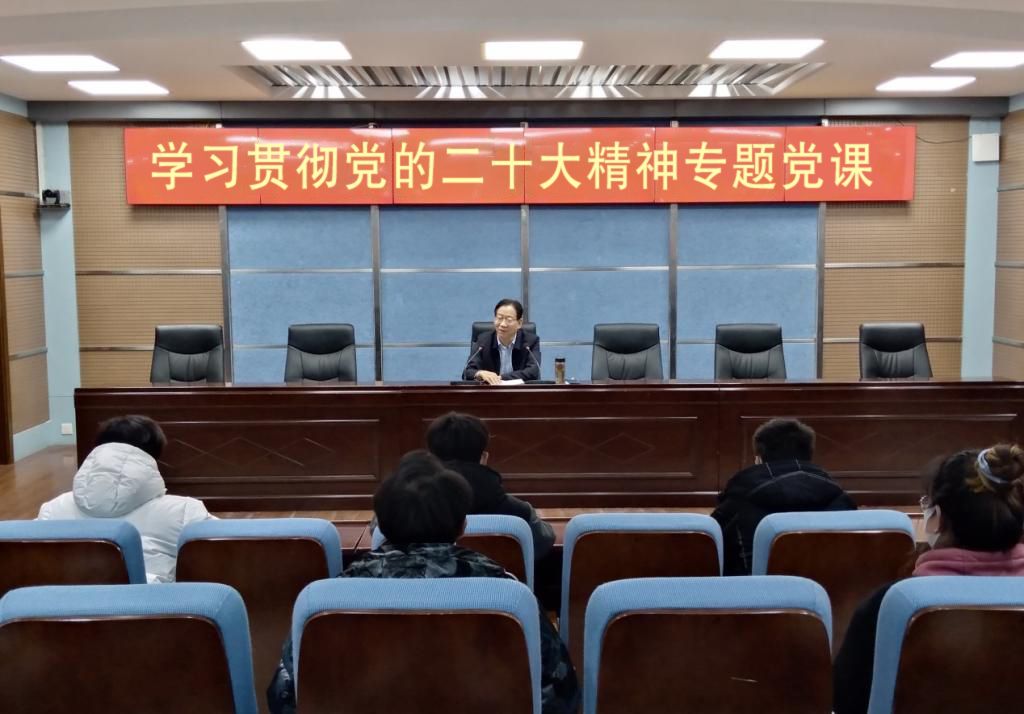 12月21日下午,副校长刘守义在3号实训楼报告厅讲授党的二十大精神专题党课,12个学院的学生干部代表聆听了报告。