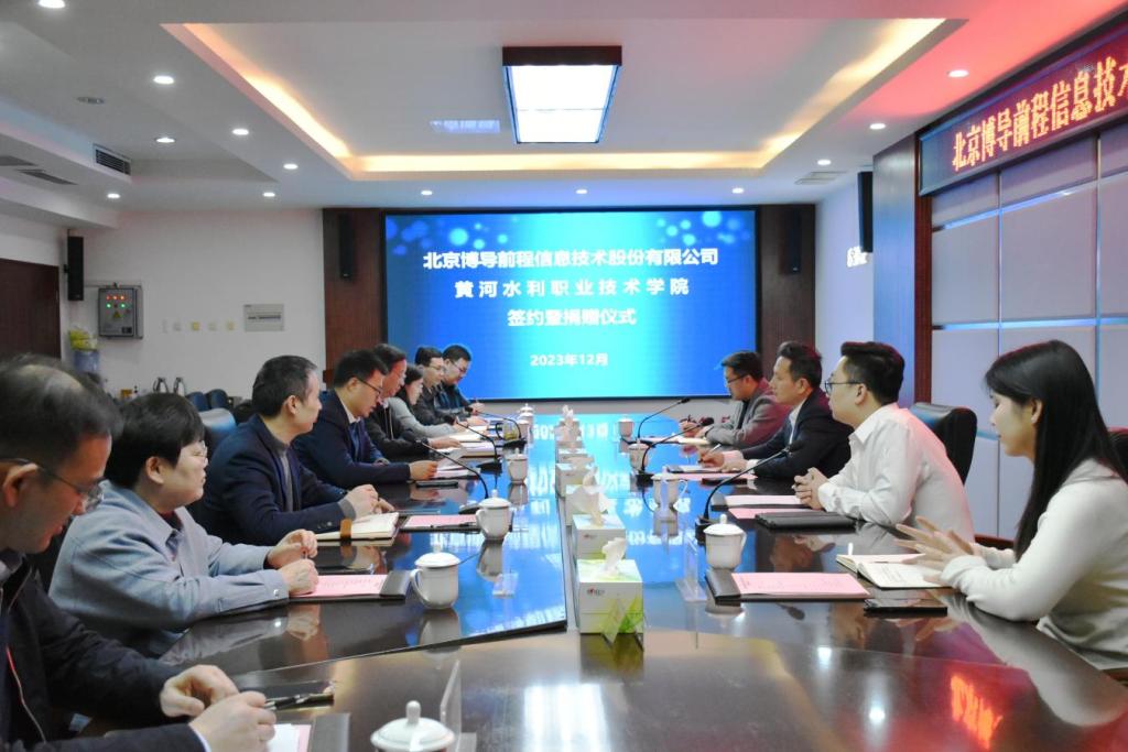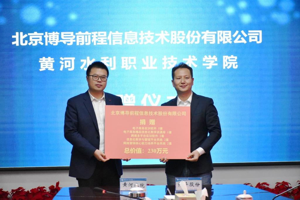 12月21日,北京博导前程信息技术股份有限公司(以下简称“博导股份”)向我校捐赠价值230万元教学资源,签约暨捐赠仪式在行政楼第一会议室举行。博导股份董事长段建、营销总监罗旭东、项目经理刘新、商务经理张怡,我校党委副书记、校长胡昊,副校长刘守义,副校长朱焕立出席仪式,教务处、商务与管理学院相关负责人、教师代表等参加仪式。仪式由刘守义主持。