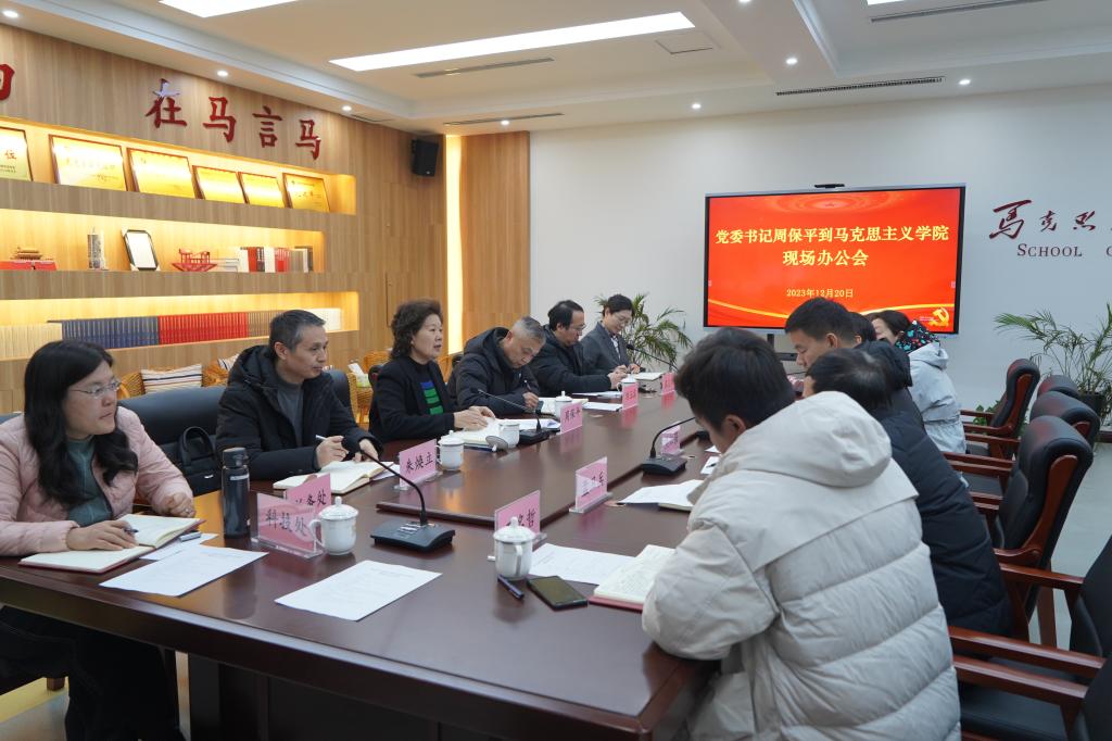 为扎实推进示范性马克思主义学院建设工作,12月20日下午,党委书记周保平带领副校长刘玉宾、朱焕立、周志琦及党政办公室、党委宣传部、人事处、教务处、计划财务处、科技处、国有资产管理处等职能部门负责同志深入马克思主义学院,召开现场办公会议,研究解决当前存在的困难和问题。马克思主义学院领导班子成员、教研室主任参加会议。会议由马克思主义学院党总支书记杜丙辰主持。