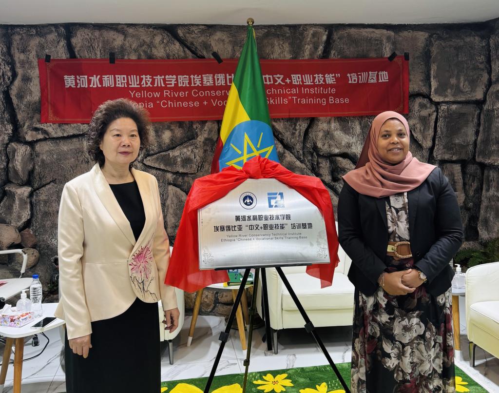 党委书记周保平与埃塞俄比亚劳动与技能部部长穆费里哈特·卡米尔共同为埃塞俄比亚“中文+职业技能”培训基地揭牌