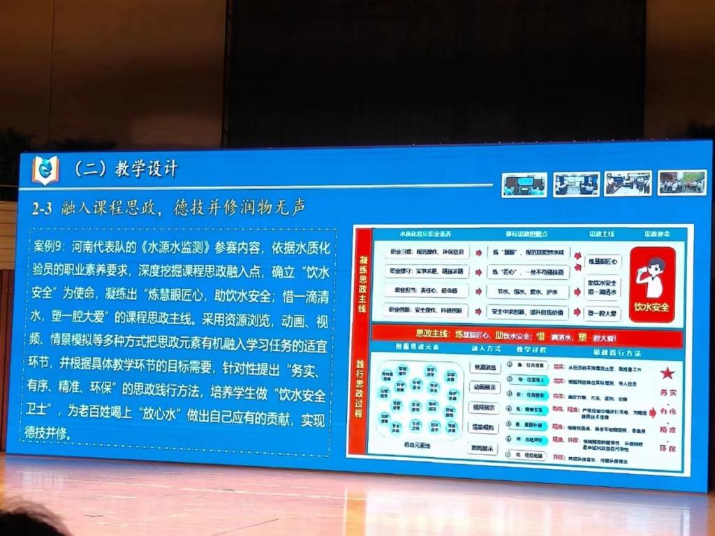 我校环境工程学院崔鹏老师带领的《水源水监测》教学团队,获奖作品出自环境监测技术专业的课程《水环境监测》,是2022年河南省职业教育和继续教学课程思政示范课。全国职业院校技能大赛教学能力比赛评判组组长姜丽萍老师在国赛闭幕式的分享会上,向来自全国的决赛团队教师共享了20个教学团队的特色优点,《水源水监测》作品以“融入课程思政,德技并修润物无声”的课程思政设计被作为精彩展示和引领示范同大家分享。