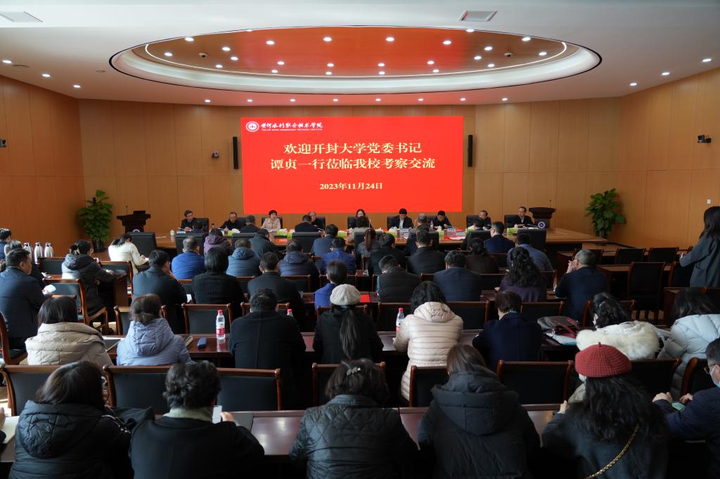 11月24日上午,开封大学党委书记谭贞带领校领导班子成员、中层干部一行70余人到我校考察交流,座谈会在行政楼学术交流活动中心会议室举行。