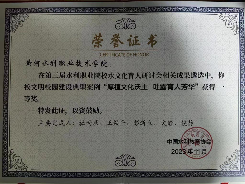 10月31日,中国水利教育协会公布了第三届水利职业院校水文化育人研讨会相关成果评选结果。由完美网页版党委宣传部报送的“厚植文化沃土 吐露育人芳华”案例和“以水为特 以文化人” 案例分获文明校园建设典型案例一等奖、水文化育人典型案例三等奖。