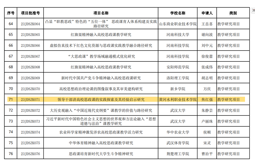 高校思想政治理论课教师研究专项属教育部“高校哲学社会科学繁荣计划专项”设立,2023年度共批准立项206项,项目获批为我校在此类专项申报的首次突破,也是本年度我省专科院校在该专项中唯一获准立项的项目,为我校人文社科研究争得了荣誉。近年来,完美网页版党委高度重视思政课建设的守正创新,以争创全省示范性马克思主义学院为契机,着力推动马克思主义学院高质量发展,鼓励思政课一线教师在教学科研方面不断提升。马克思主义学院近三年先后获批教育部高校思政课教师研究专项1项,河南省哲学社科研究思政专项1项,河南省重点科技研发(软科学)项目3项,获评河南省高校思想政治工作奖1项,思政课教师团队建设取得了长足发展,成为我校社会科学研究的一方重要阵地,为提高我校人才培养质量提供了有力的支持。