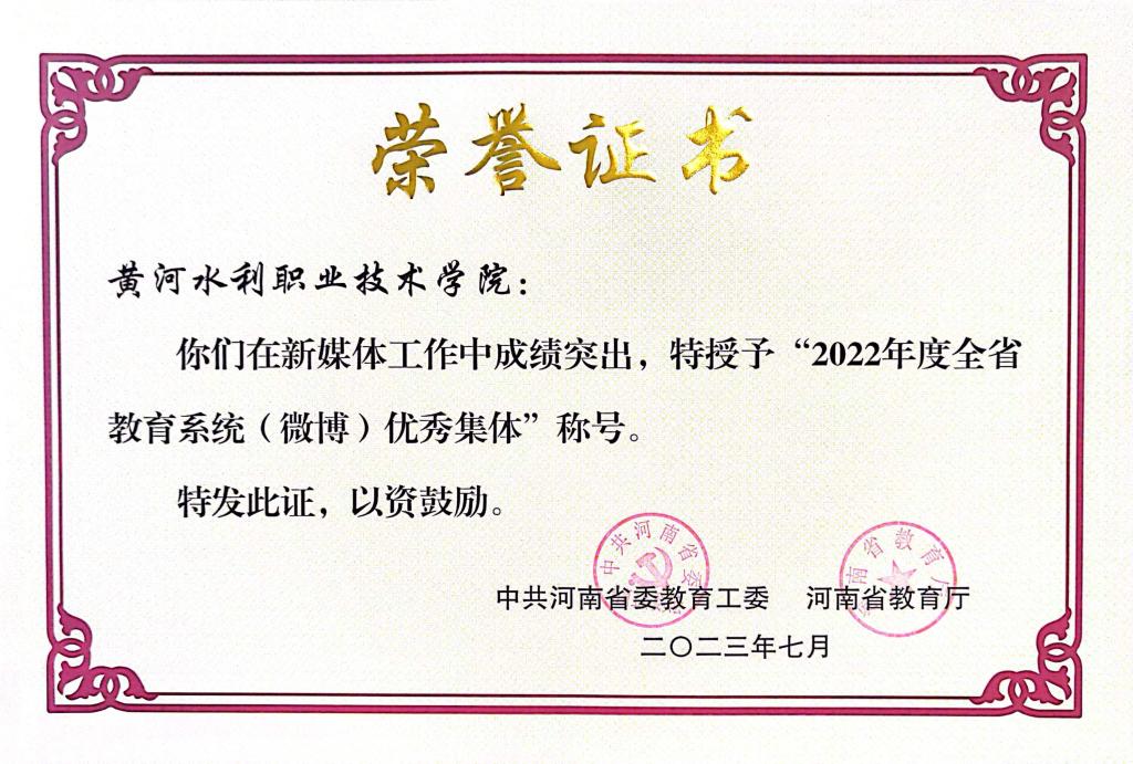 近日,中共河南省委教育工委、河南省教育厅授予我校“2022年度全省教育系统(微博)优秀集体”称号。