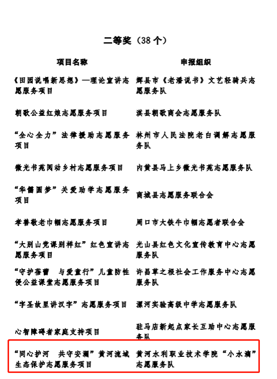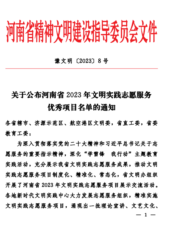 近日,河南省精神文明建设指导委员会公布河南省2023年文明实践志愿服务优秀项目名单,经推荐选拔、材料初审、专家复审、现场展示交流、评委打分点评、新闻媒体公示等环节,我校“同心护河 共守安澜”黄河流域生态保护志愿服务项目在全省推荐上报的255个项目中脱颖而出,荣获二等奖。