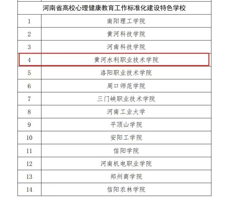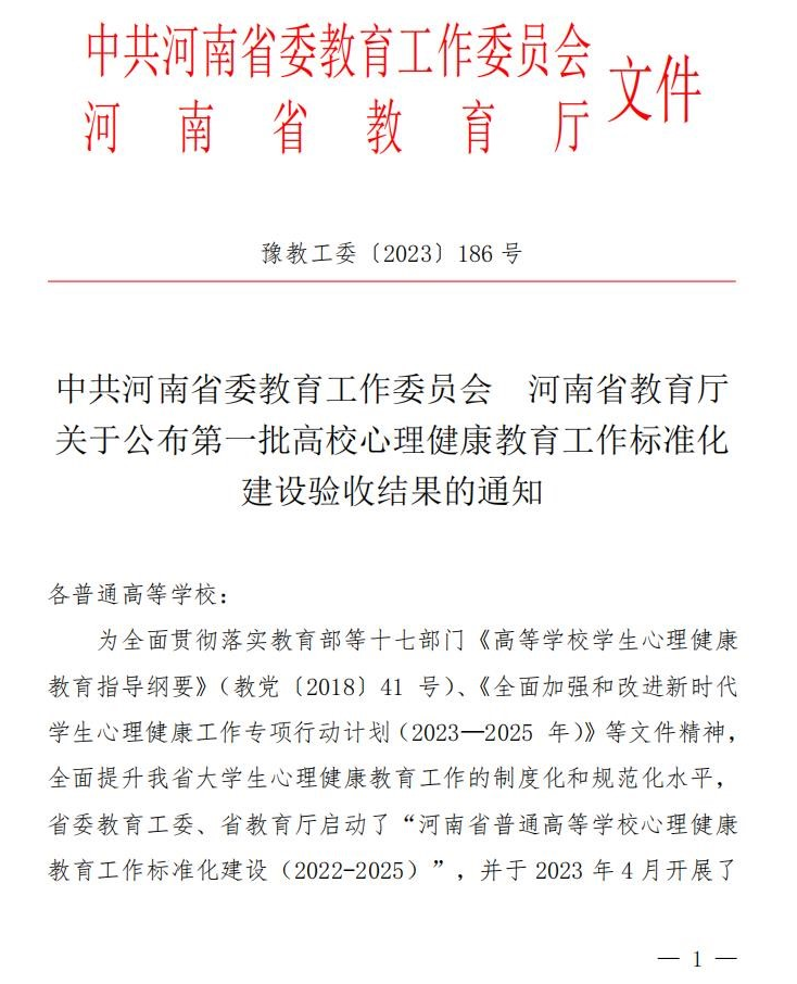 近日,中共河南省委教育工作委员会、河南省教育厅下发了《完美网页版公布第一批高校心理健康教育工作标准化建设验收结果的通知》(豫教工委〔2023〕186号),我校顺利通过此次验收并被评选为河南省高校心理健康教育工作标准化建设特色完美网页版。