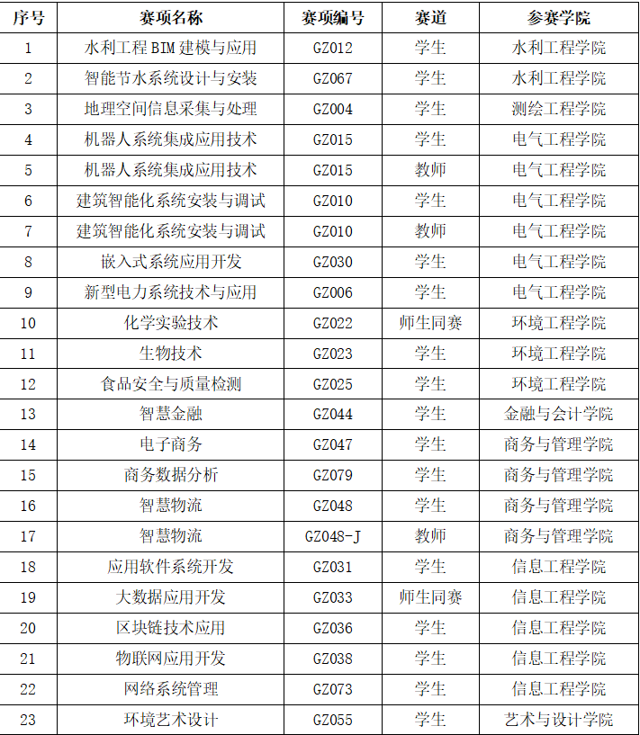 2023年国赛赛项变化较大,多个赛项竞赛名称、内容、标准发生变化,部分赛项进行了增减。经过省赛选拔,水利工程学院、测绘工程学院、电气工程学院、环境工程学院、金融与会计学院、商务与管理学院、信息工程学院、艺术与设计学院的23支代表队获得国赛参赛资格。(详见下表)