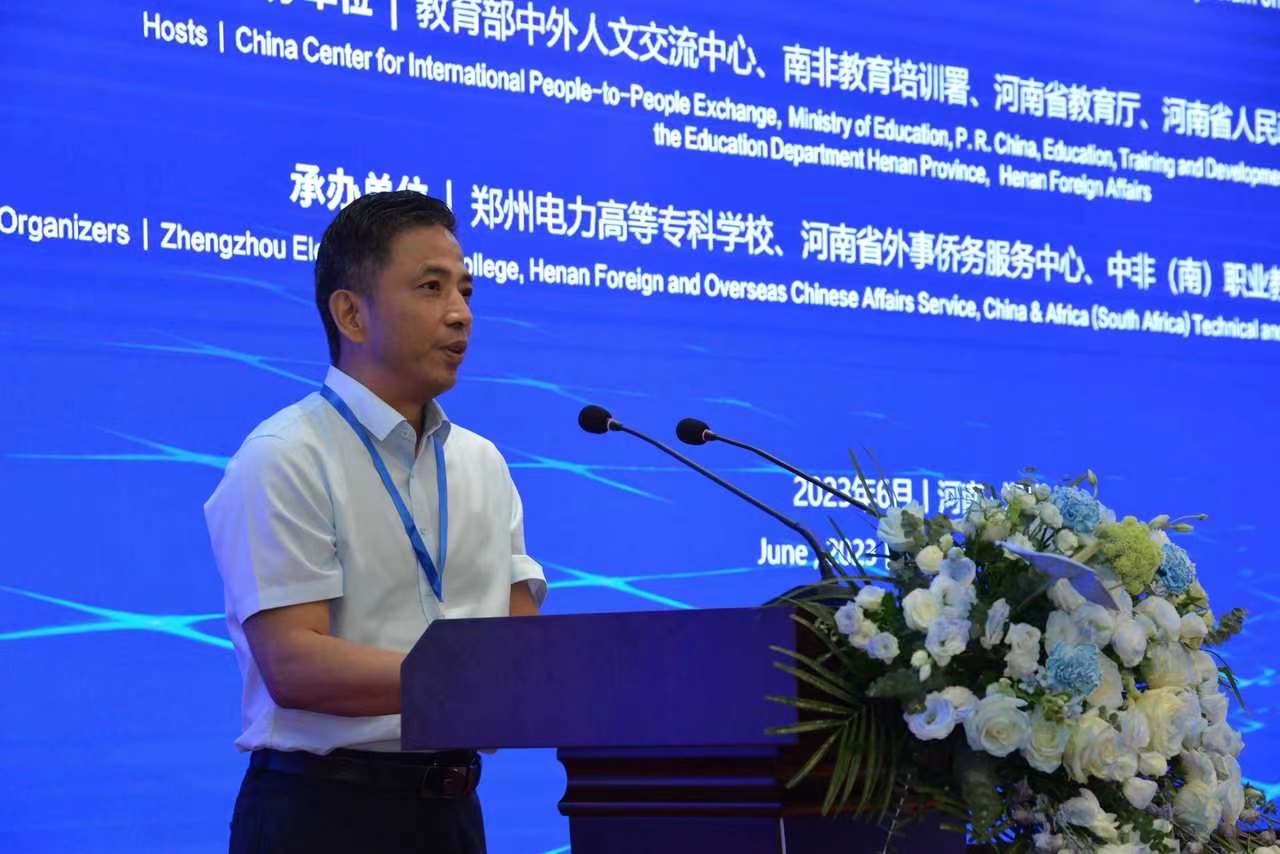 6月28日—30日,第五届中非(南)职业教育合作联盟年会暨中非职业教育高质量发展国际研讨会在河南郑州召开。教育部国际司副司长贾鹏、教育部中外人文交流中心主任杜柯伟、南非高等教育与培训部副总司长尊古、中国驻南非大使馆教育参赞李旭东、河南省教育厅副厅长刁玉华等出席会议并致辞。作为联盟中方理事会常务副理事长单位,我校党委副书记、校长胡昊,副校长菅浩然参会。