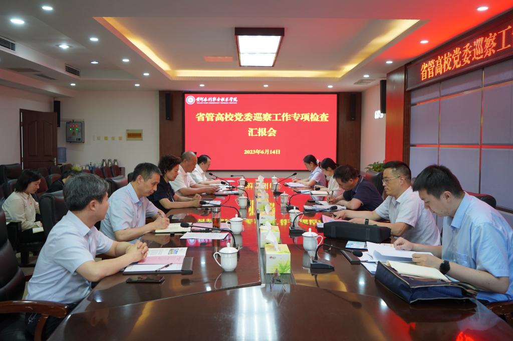 6月14日,省管高校党委巡察工作专项检查组在省委巡视办巡察指导二处处长徐国富的带领下,一行5人莅临我校对我校党委巡察工作进行检查指导。巡察工作领导小组组长、校党委书记周保平,巡察工作领导小组副组长杨士恒,巡察工作领导小组副组长朱焕立,副校长周志琦,纪委书记刘许亮,党委巡察工作办公室负责人、校巡察组组长参加会议。会议由杨士恒主持。