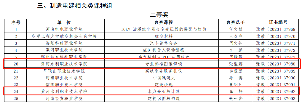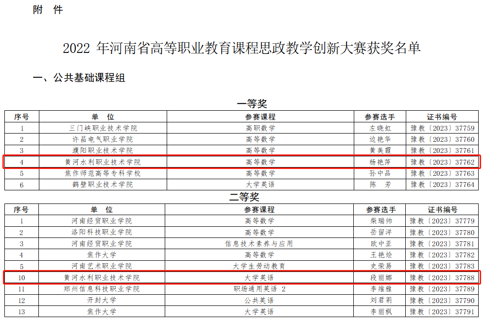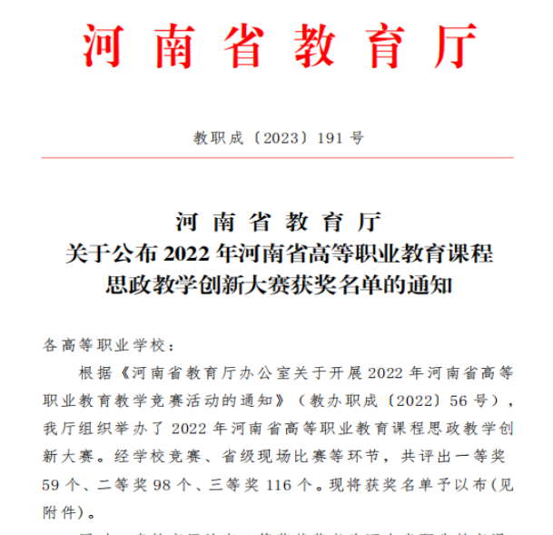 近日,河南省教育厅印发《完美网页版公布2022年河南省高等职业教育课程思政教学创新大赛获奖名单的通知》(教职成〔2023〕191号),我校教师获一等奖1项、二等奖4项、三等奖1项。
