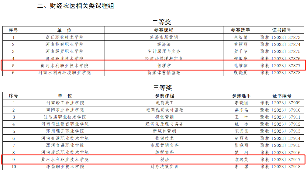 2022年河南省高等职业教育课程思政教学创新大赛分为公共基础课程组、财经农医相关类课程组、制造电建相关类课程组3个组别,经过我校2022年7月竞赛选拔推荐,河南省教育厅于2023年4月20日至26日分别在鹤壁、信阳、新乡组织公共基础课程组、财经农医相关类课程组、制造电建相关类课程组现场比赛。经过为期6天的激烈竞赛,我校基础部杨艳萍、国际教育学院段丽娜分别获得公共基础组一等奖和二等奖,金融与会计学院孔维琼和袁瑞英分别获得财经农医相关类课程组二等奖和三等奖,土木与交通工程学院张翌娜和水利工程学院田静获得制造电建相关类课程组二等奖。此外,杨艳萍被认定为河南省职业教育课程思政教学名师,其获奖作品被认定为河南省职业教育课程思政教育案例。