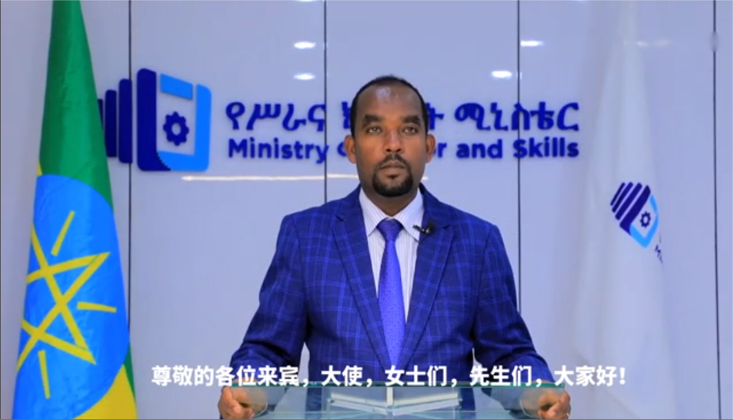 埃塞俄比亚劳动与技能部国务部长特沙莱·贝雷查·亚德萨通过视频方式致辞。他谈到:近年来,埃中全面合作伙伴关系迅速发展并取得了丰硕成果,尤其是在教育和文化领域。我们今天相聚在此,也是埃中双方以往交流的延续,“中文+职业技能”项目,将为埃赛俄比亚劳动力市场培养高素质技能人才,大大提升埃塞俄比亚毕业生的就业力,为埃塞俄比亚技术职业教育培训添砖加瓦。