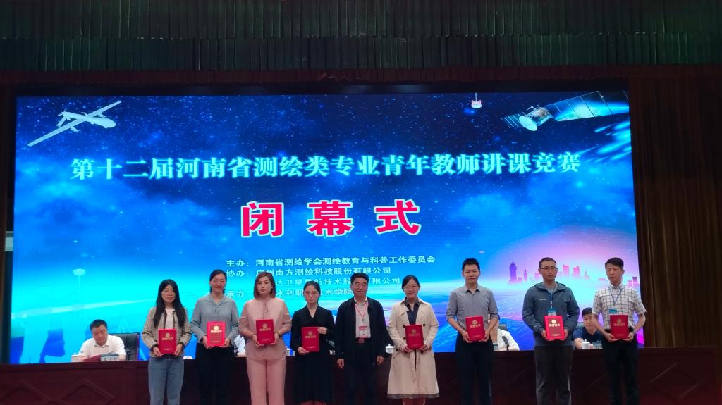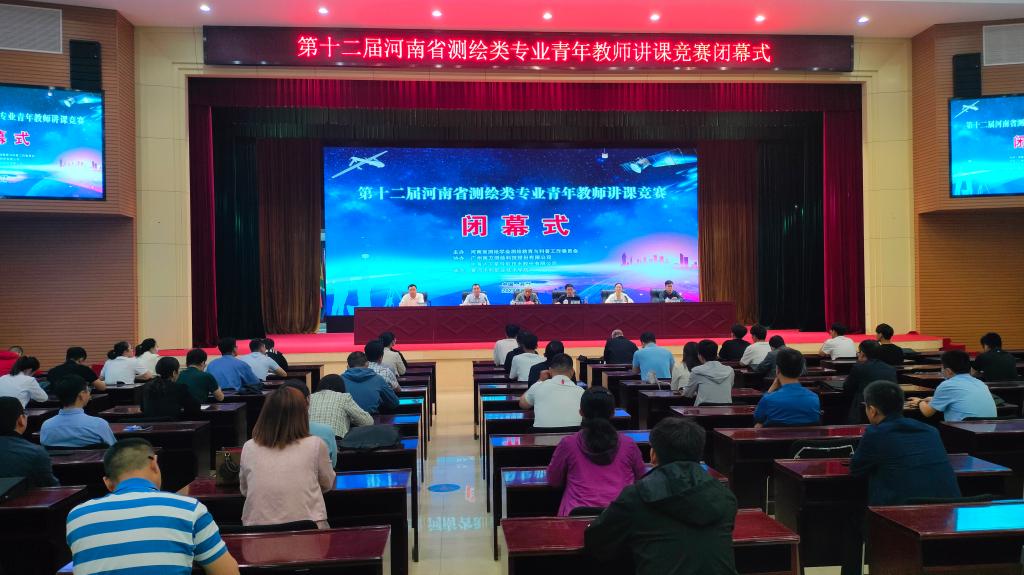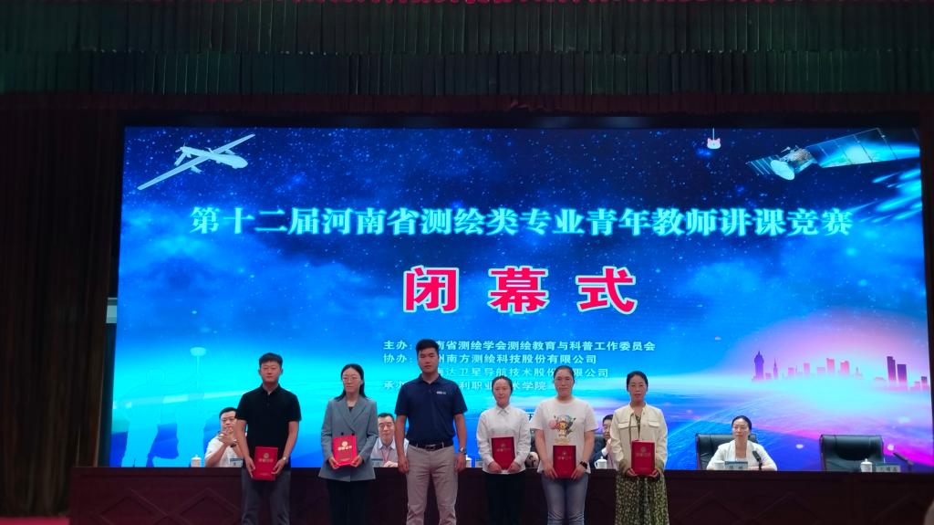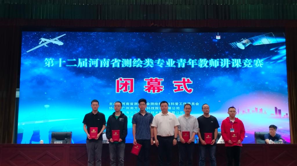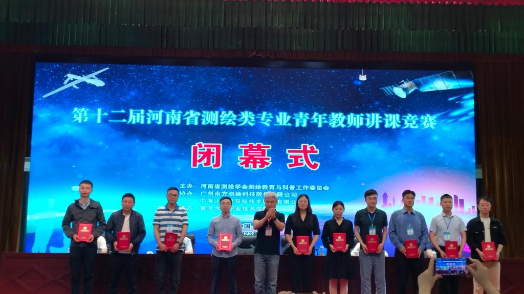 闭幕式由我校测绘地理信息全国黄大年式教师团队负责人陈琳教授主持,河南省测绘学会测绘教育与科普工作委员会副主任翟翊教授对本次竞赛进行了点评,河南测绘学会测绘教育与科普工作委员会主任阎晓东教授宣布获奖名单,广州南方测绘科技股份有限公司河南分公司副总经理王小刚、广州中海达卫星导航股份有限公司河南区经理亢耀磊、解放军信息工程大学阎晓东教授、翟翊教授分别为二等奖、一等奖和特等奖获奖教师颁奖。