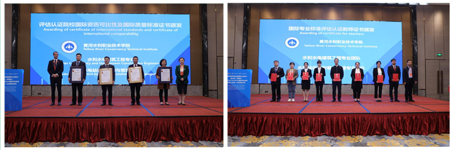 会上,诺安文、李华杰为我校水利水电建筑工程和水电站设备安装与管理专业颁发“国际资历可比性及国际质量标准证书”。菅浩然为专业团队教师代表颁发“专业标准评估认证教师证书”。