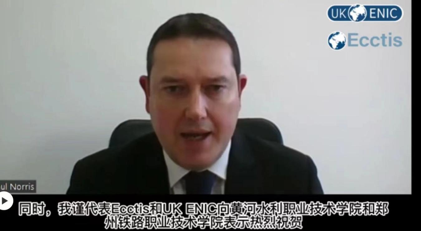 保罗·诺里斯致辞,对我校参评专业通过国际专业评估认证表示祝贺,并对专业教师团队在整个评估认证过程中呈现出的敬业精神和工作成效给予高度评价。他表示,评估认证工作协助中国高职院校对接国际最佳资历标准,提升专业国际化水平,为院校进一步输出专业标准奠定了坚实的基础。