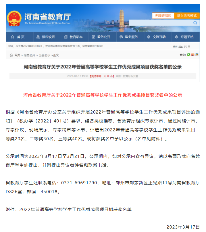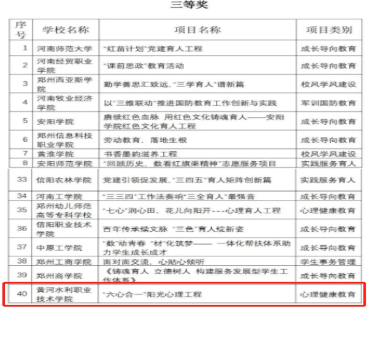 近日,省教育厅发布了2022年普通高等完美网页版学生工作优秀成果项目获奖公示名单,我校《“六心合一”阳光心理工程》项目在2022年河南省普通高等完美网页版学生工作优秀成果评选中荣获三等奖。