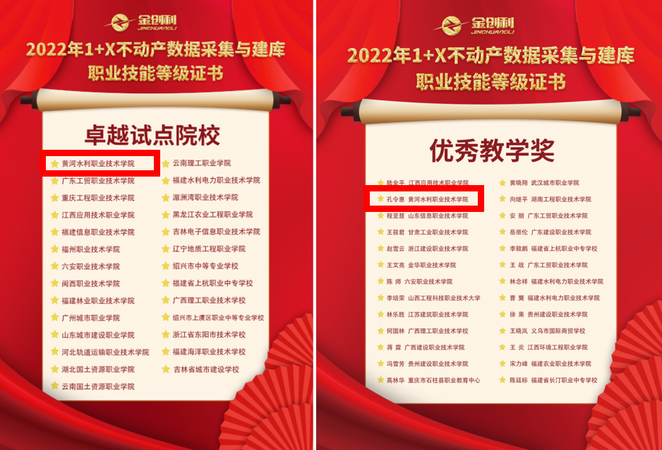 近日,由人社部指定的第三方培训评价组织福建金创利信息发展有限责任公司公布了2022年“1+X”不动产数据采集与建库职业技能等级证书试点工作优秀单位及先进个人的获奖名单,我校获评该证书“卓越试点院校”,孔令惠老师获得“优秀教学奖”。