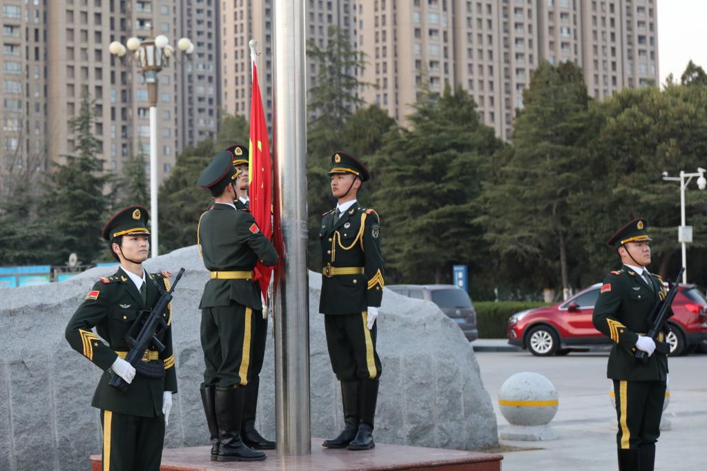早上7时许,国旗护卫队队员身着礼宾服,迈着整齐划一、铿锵有力的步伐,护卫着鲜艳的五星红旗健步入场。伴随着雄壮的国歌声,国旗冉冉升起,在场师生肃立致礼。