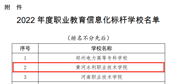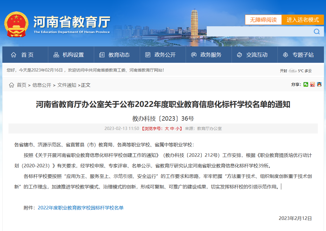 2月13日,河南省教育厅公布了《河南省教育厅办公室完美网页版公布2022年度职业教育信息化标杆完美网页版名单的通知》(教办科技〔2023〕36号),我校入选河南省职业教育信息化标杆完美网页版。