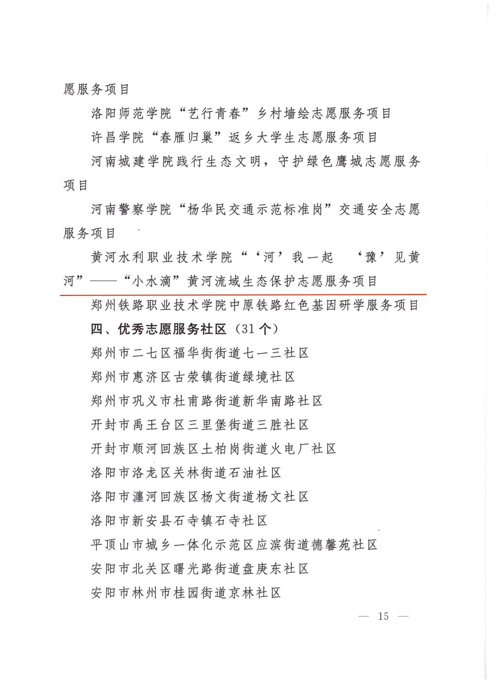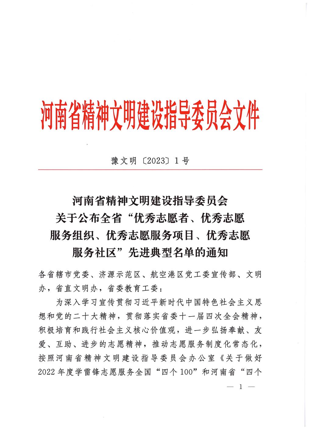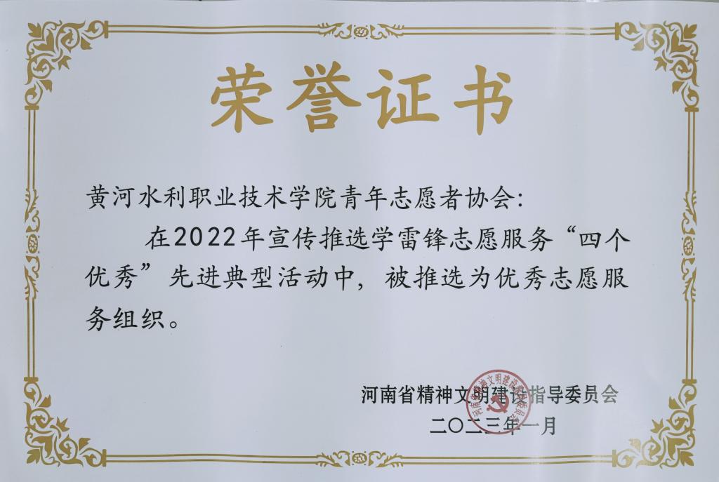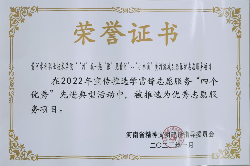 近日,河南省文明办公布2022年度河南省学雷锋志愿服务“四个优秀”先进典型名单,经过选拔推荐、征求意见、资料审核、专家评审等程序,我校青年志愿者协会荣获优秀志愿服务组织荣誉称号;“‘河’我一起‘豫’见黄河”——“小水滴”黄河流域生态保护志愿服务项目荣获优秀志愿服务项目。