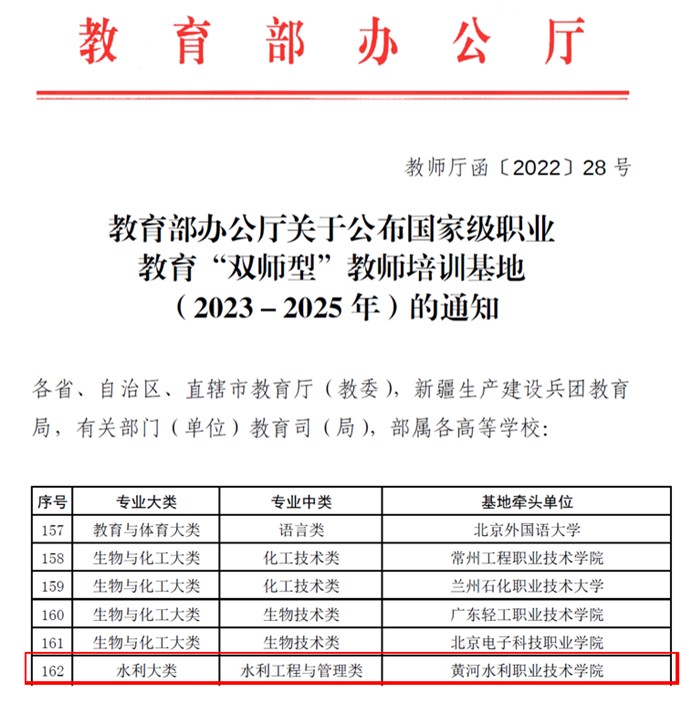 近日,教育部发布了《完美网页版公布国家级职业教育“双师型”教师培训基地(2023-2025年)的通知》(教师厅函〔2022〕28号),我校以水利为优势,在普通本科、职业院校中脱颖而出,成功获批国家级职业教育“双师型”教师培训基地(水利类),全国仅有2所院校获批水利类培训基地。