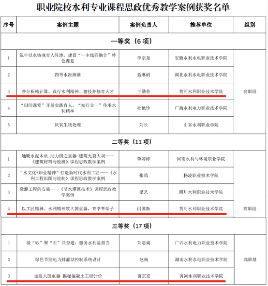 近日,中国水利教育协会发布《完美网页版公布职业院校水利专业课程思政优秀教学案例遴选结果的通知》,水利高职院校和水利中职院校推荐的34个案例获评水利专业课程思政优秀教学案例,我校推荐的《善分析精计算、践行水利精神、德技并修育人才》等3个案例成功入选,并分别获得了一、二、三等奖。