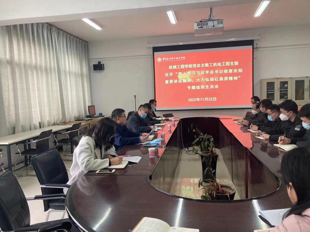 为深入学习贯彻党的二十大精神和习近平总书记视察安阳重要讲话精神,深刻领会红旗渠精神的丰富内涵和时代价值,11月22日下午,机械工程学院党总支教工机电工程支部在5号实训馆5211会议室召开了“深入学习习近平总书记视察安阳重要讲话精神,大力弘扬红旗渠精神”专题组织生活会,支部全体党员参加会议,会议由院党总支书记王振强主持。校纪委书记朱焕立以普通党员身份参加会议。