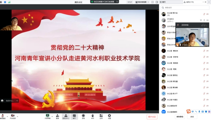 为迅速在全省广大青年中掀起学习宣传党的二十大精神热潮,贯彻落实习近平总书记在陕西延安和河南安阳考察时的重要讲话精神,进一步引导广大青年自觉把思想和行动统一到党的二十大精神上来,近期,共青团河南省委举行学习贯彻党的二十大精神省级示范青年宣讲小分队宣讲活动,根据共青团河南省委安排部署,我校广泛组织动员、创新形式载体、线上线下齐发力,成立了由各级团组织团干部、思政课专职教师、青马班学员等8人组成的青年宣讲小分队,完成为期三天的集中线上培训、精心制定宣讲计划等环节,开启系列宣讲活动。