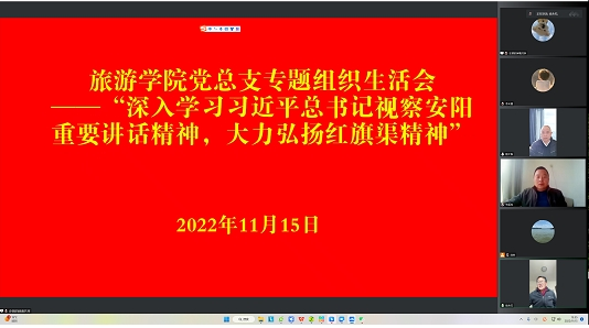 11月15日下午,旅游学院党总支教工、学生旅游支部以线上的形式开展了“深入学习习近平总书记视察安阳重要讲话精神,大力弘扬红旗渠精神”专题组织生活会。旅游学院党总支全体党员参加了学习,校党委副书记、工会主席杨士恒以普通党员身份参加组织生活会。会议由党总支书记刘岩主持。