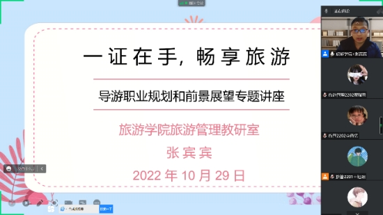 旅游学院 旅游管理教研室组织旅游管理专业、酒店数字化运营与管理、民宿运营管理专业,开展“一证在手,畅享旅游——导游职业规划和前景展望”的交流互动。从导游员资格证的地位作用、考试形式、备考方法、智慧旅游、文博旅游、在线旅游等方面,对导游职业场景和职业生涯发展做分享。通过师生交流分享,拓宽了专业视野、了解了前沿趋势,学生对智慧旅游、云旅游、智慧文博、在线导游等新业态都有了深刻的认识。