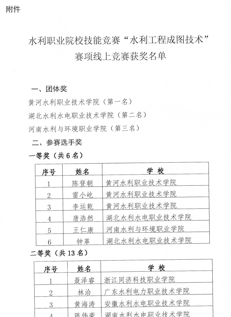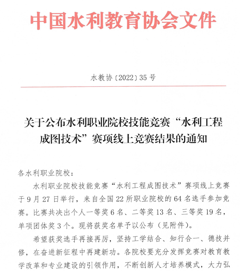 近日,全国水利职业院校技能竞赛“水利工程成图技术”赛项在我校成功举办。经过激烈角逐,我校水利工程制图代表队荣获团体奖第一名并包揽一等奖前三名,充分展现了我校较强的办学实力和师生的技能水平,彰显了“双高”建设成效。