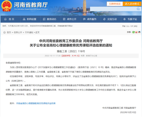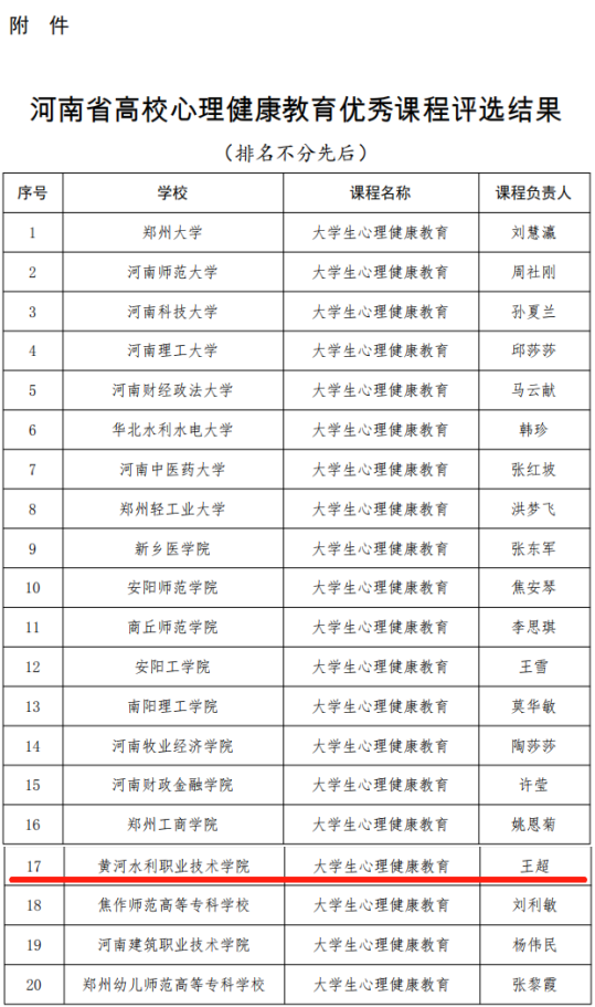 近日,中共河南省委教育工作委员会、河南省教育厅印发《完美网页版公布全省高校心理健康教育优秀课程评选结果的通知》(豫教工委〔2022〕116号),全省共评选出20门优秀《大学生心理健康教育》课程,其中本科院校16门、高职院校4门,我校王超老师负责的《大学生心理健康教育》课程位列其中。