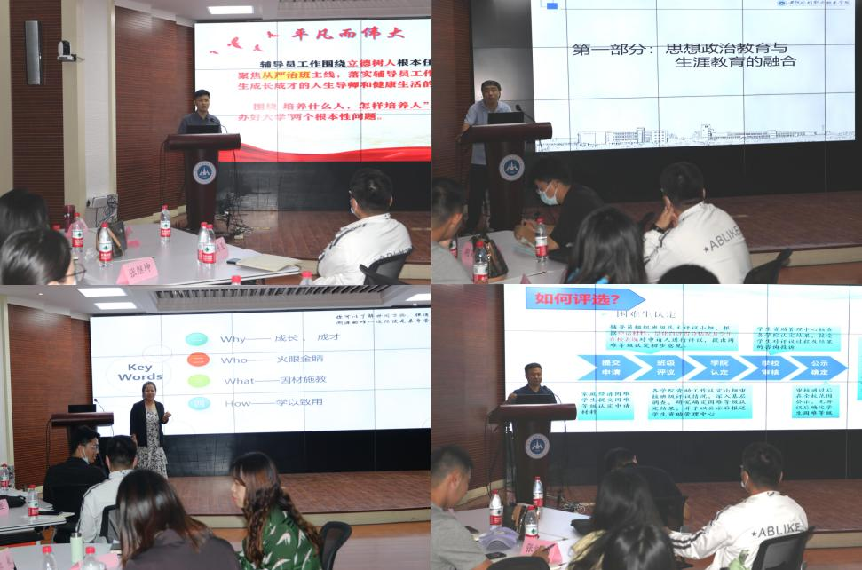 本次培训历时四天,共设9个专题。河南省第九届辅导员素质能力大赛特等奖获得者赵诗捷通过小游戏“滚雪球”带领辅导员开启职业生涯,并寄语新任辅导员们做好这份“永远年轻,永远热泪盈眶的工作”;水利工程学院党总支副书记申浩围绕我校辅导员队伍建设现状和学生工作现状,详细分析了辅导员的发展途径,帮助辅导员们开拓路工作思路;学生管理科科长王宇依据学生手册和多个典型案例,就如何做好学生事务管理、守好安全底线和辅导员们进行了经验分享;马克思主义形势与政策教研室主任赵俊亚讲述了如何在疫情背景下做好学生的价值引导,助力学生正向成长;学生资助管理科科长董新法,通过分享资助典型案例详细讲解了资助政策以及资助工作的具体流程;心理健康教育教研室主任王超以丰富的心理咨询案例,对辅导员开展心理健康教育工作给予了针对性指导和建议;就业指导咨询科科长龚向哲与新任辅导员们探讨了如何做好青年学生的职业生涯规划与就业指导;信息工程学院辅导员何昕从快速适应工作岗位、如何实现自身成长与发展、辅导员日常工作有哪些小技巧等方面进行了干货分享;辅导员阶梯式成长工作室负责人曹睿带队参观校园,帮助新入职辅导员们更深入全面地了解我校的厚重校史和发展历程。