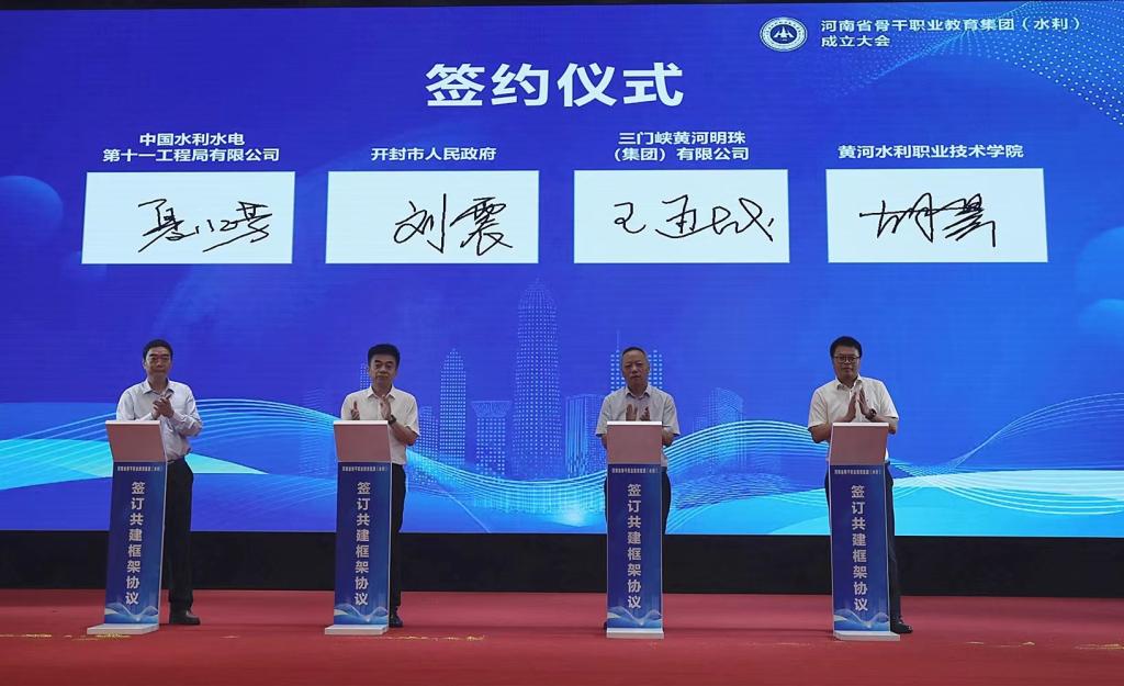 会上,陈垠亭为河南水利骨干职业教育集团授牌。与会领导共同为河南水利骨干职业教育集团举行启动仪式。刘震、王通战、夏水芳、胡昊共同签署了河南水利骨干职业教育集团共建框架协议。(摄影:党委宣传部 袁洪博 翟雨航)