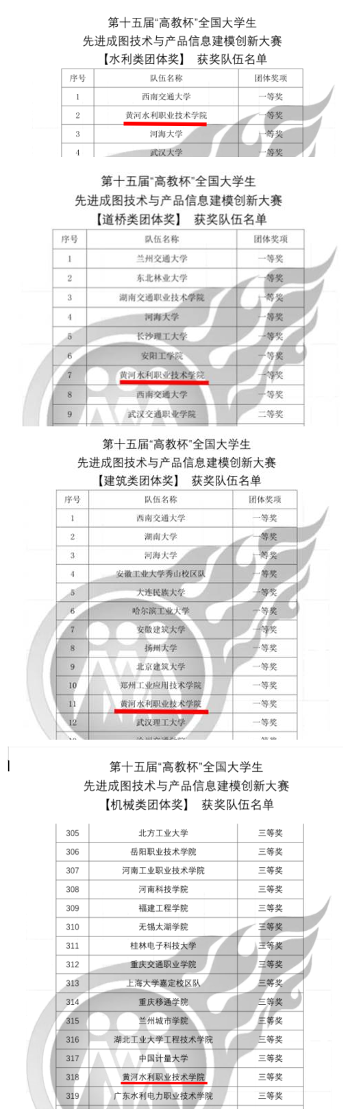 7月29日-8月2日,第十五届“高教杯”全国大学生先进成图技术与产品信息建模创新大赛在江苏大学成功举办,共有来自全国675所高校,1040支参赛队伍,10344名选手参加,参赛规模创历年之最。我校水利工程学院、土木与交通工程学院、机械工程学院共派出4支代表队参加了水利类、道桥类、建筑类、机械类四个类别的项目比赛。经过激烈角逐,我校荣获水利类团体一等奖、道桥类团体一等奖、建筑类团体一等奖、机械类团体三等奖。参赛选手共获得个人全能一等奖23项、二等奖22项、三等奖14项。这是我校第13次荣获水利类团体一等奖,也是唯一一所获此殊荣的高职院校。
