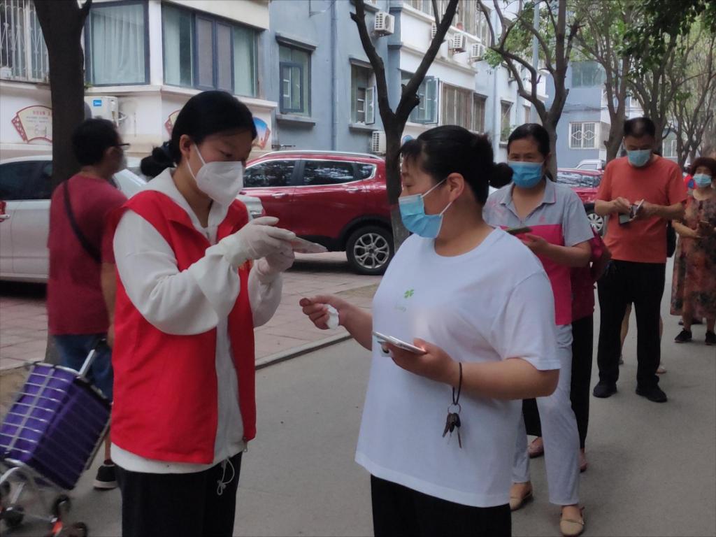 7月28日,由团委书记范龙、社团实践部部长蒋晓絮组织带领13名青年志愿者到开封市复兴社区进行助力社区疫情防控志愿服务活动。活动期间,志愿者们分组在各住宅小区开展疫情防控扫码、指导他人使用手机扫码、帮助社区老年人提供信息登记等志愿服务工作。“请大家戴好口罩、保持间距,入区请自觉扫描场所码”“请大家提前扫描场所码”“请大家打开微信小程序、扫描场所码后方可进入小区.......”。社区部分老年人不会使用手机扫码,志愿者们耐心的为其讲解并演示示范,大家耐心、细致、周到的服务得到了社区群众的一致好评,展现了我校团员青年良好的精神面貌。此次志愿服务活动,志愿者们同街道社区工作人员携手抗疫,在疫情大考中淬炼能力作风,用实际行动践行“奉献、友爱、互助、进步”的志愿服务精神,为打好打赢疫情防控阻击战作出应有贡献。